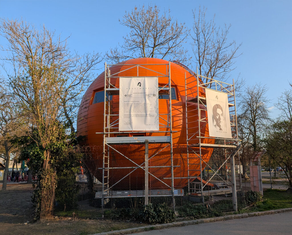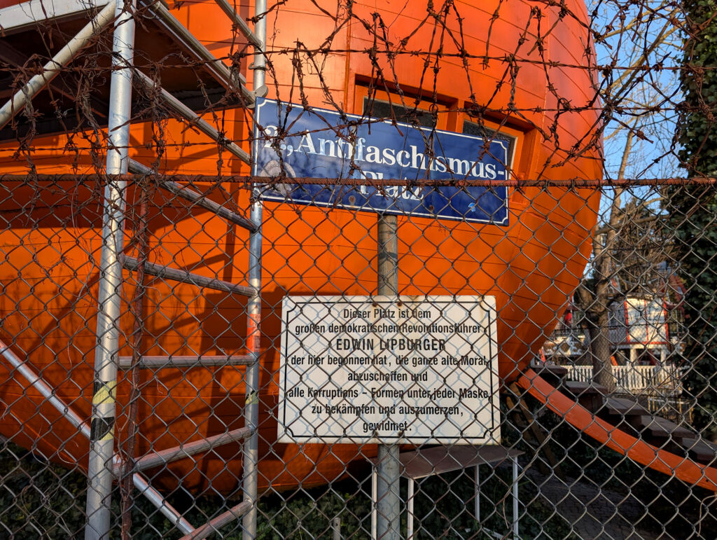 Das orange Kugelhaus am Antifaschismusplatz ist nicht einfach nur ein auffälliges sondern auch geschichtsträchtiges Bauwerk. 1971 wurde das Bekenntnis zum Runden von Edwin Lipburger in Niederösterreich errichtet. Fünf Jahre später rief Lipburger die (nicht offiziell anerkannte) Republik Kugelmugel aus. 1982 wurde der Sitz der Republik Kugelmugel an seinen heutigen Platz im Wiener Prater verlegt – mit Unterstützung des damaligen Kulturstadtrats Helmut Zilk.
