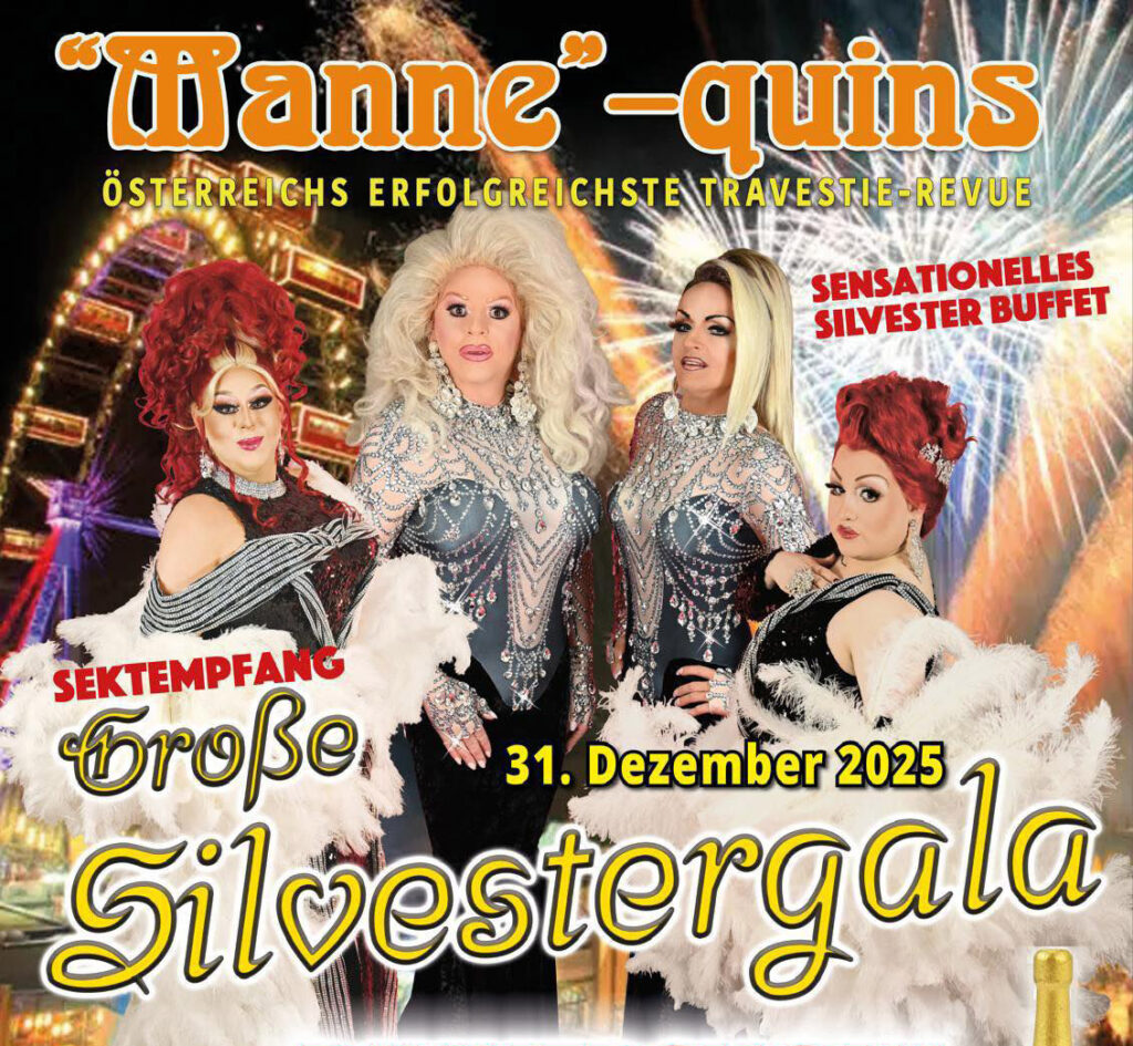 This New Year’s Eve, the Prater Alm invites you to a grand dinner show by the "Manne"-quins, Austria’s most successful travesty revue. Alongside spectacular entertainment, you can look forward to a welcome glass of sparkling wine and a lavish New Year’s Eve buffet.